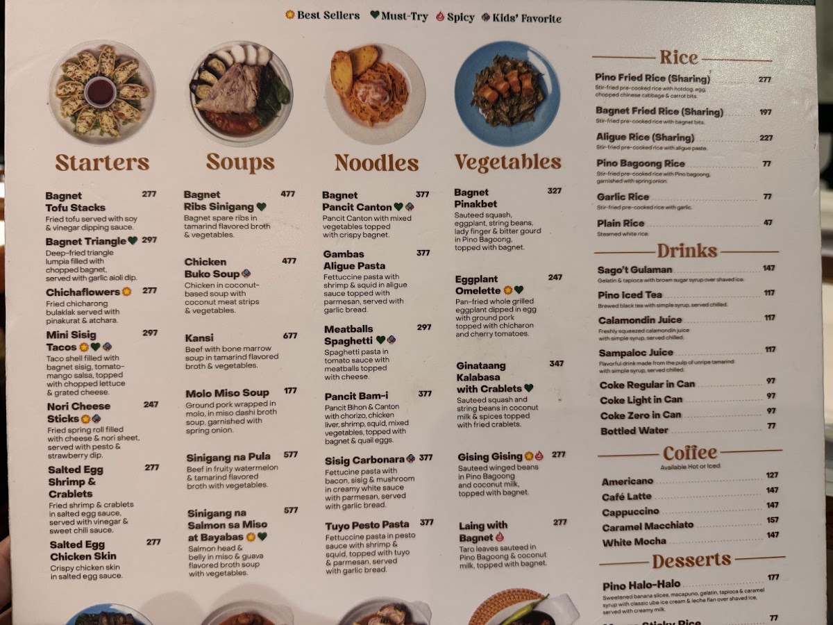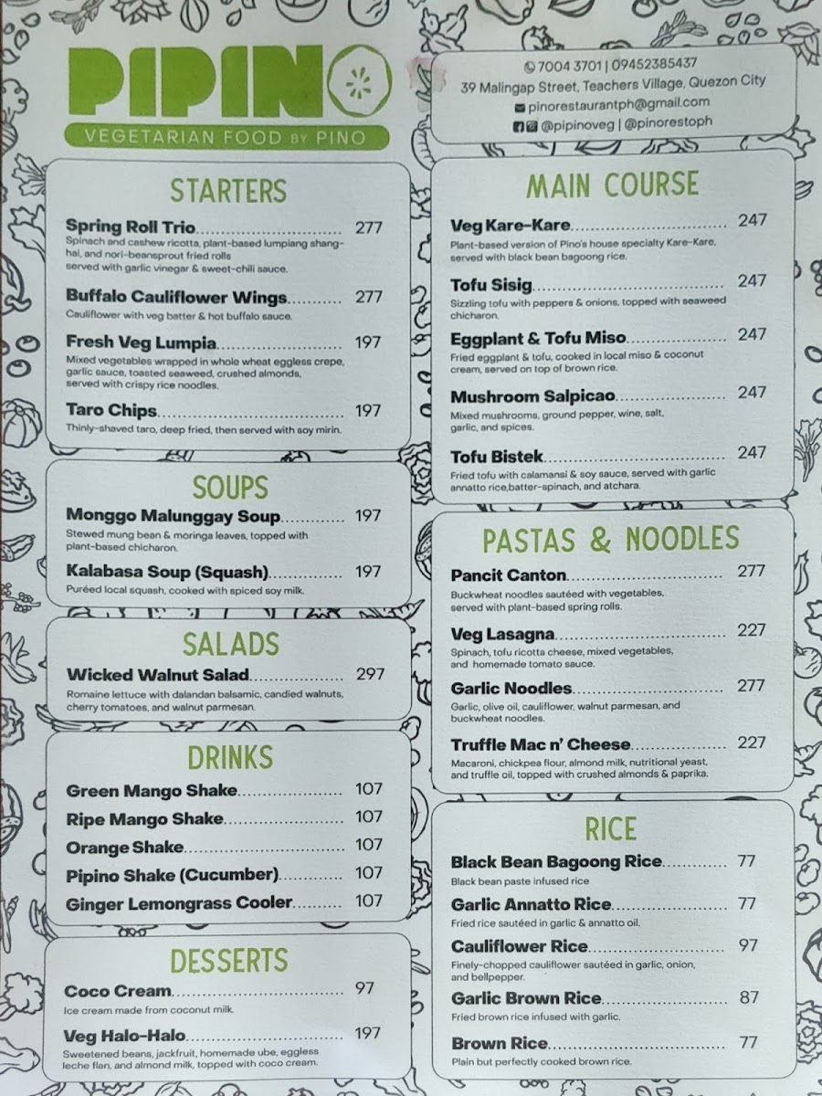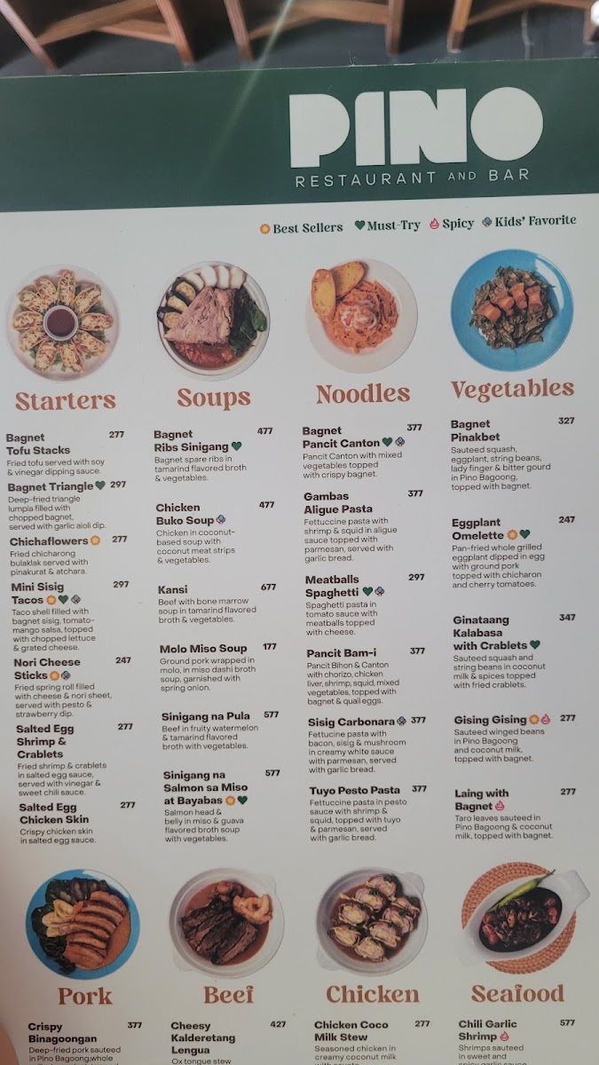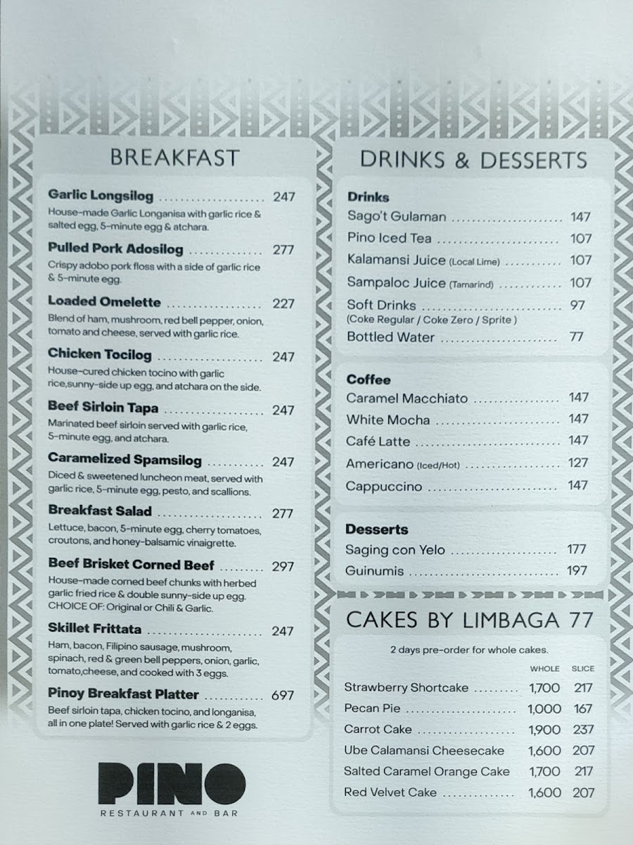 Pino Restaurant in Teachers Village East offers a diverse and enticing menu that caters to a variety of tastes, blending classic Filipino flavors with creative twists. For starters, guests can enjoy unique offerings like Chichaflowers and Nori Cheesesticks, or indulge in crispy delights such as Bagnet Triangle and Salted Egg Chicken Skin. The pasta and noodles section features comforting dishes like Sisig Carbonara and Pancit Bam-I, while the vegetable options include the savory Bagnet Pinakbet and creamy Ginataang Kalabasa with Crablets. Meat lovers will appreciate the rich flavors of Cheesy Kalderetang Lengua and Coffee-Crusted Beef Brisket, while seafood enthusiasts can savor dishes like Chili Garlic Shrimp and Seafood Kare-Kare. For a lighter touch, the restaurant also offers refreshing drinks such as Ripe Mango Shake and hearty soups like Monggo Malunggay Soup. The dessert menu doesn't disappoint, with decadent options like the Ube Calamansi Cheesecake and Tablea Cheesecake. With a selection of rice dishes, party trays, and breakfast options like the Pulled Pork Adosilog, Pino Restaurant ensures that there's something for every palate, all at reasonable prices. Whether you're in the mood for something traditional or adventurous, the menu is sure to satisfy.