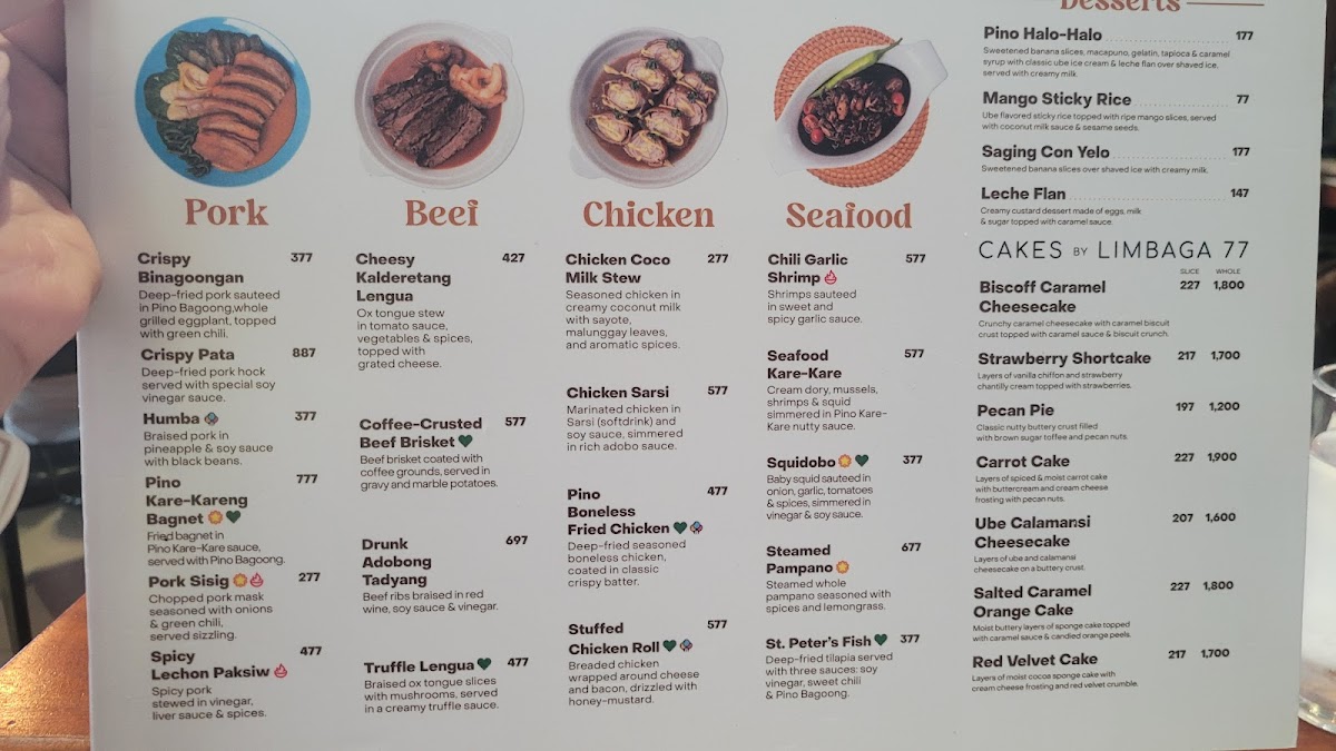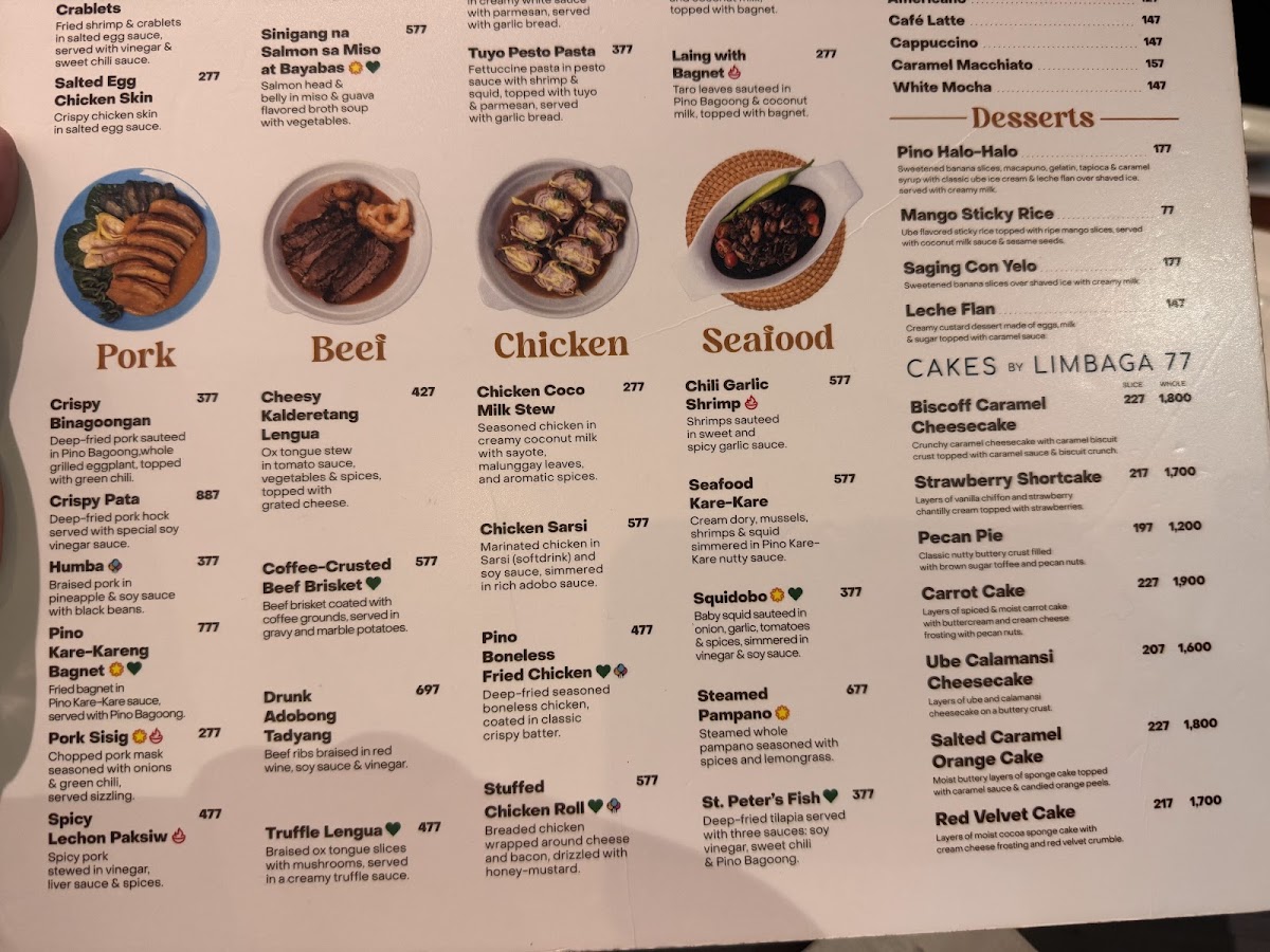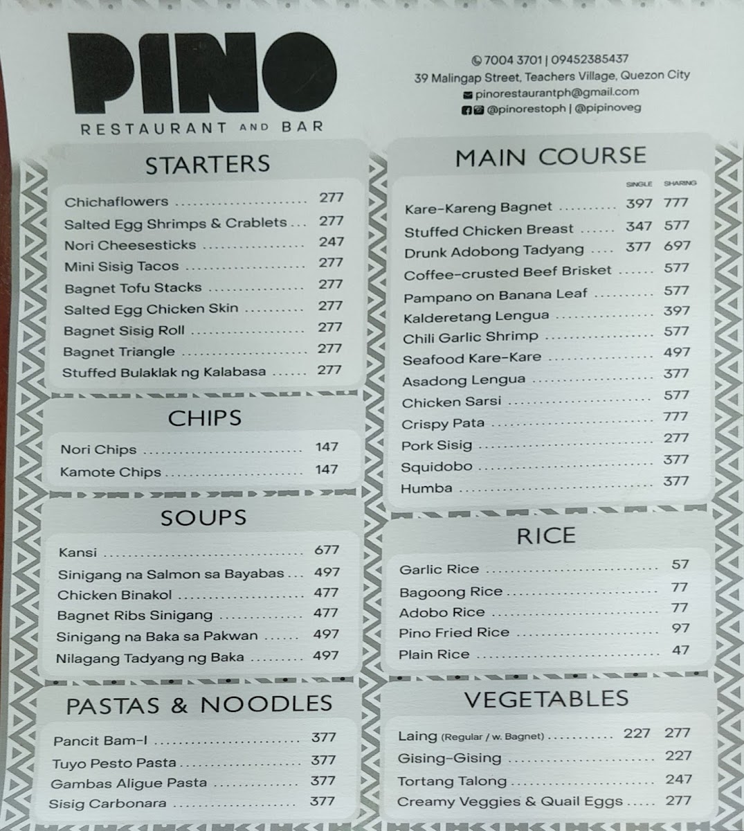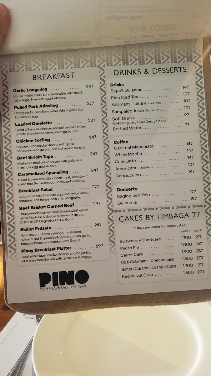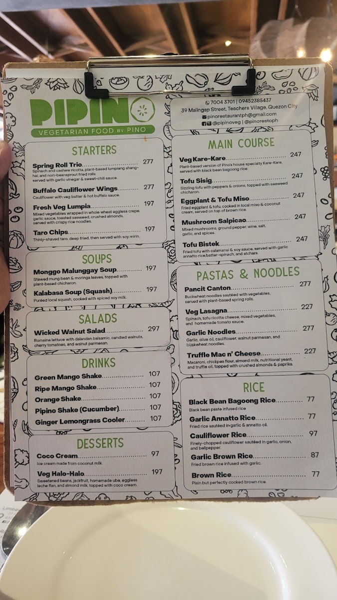 Pino Restaurant in Teachers Village East offers a diverse and enticing menu that caters to a variety of tastes, blending classic Filipino flavors with creative twists. For starters, guests can enjoy unique offerings like Chichaflowers and Nori Cheesesticks, or indulge in crispy delights such as Bagnet Triangle and Salted Egg Chicken Skin. The pasta and noodles section features comforting dishes like Sisig Carbonara and Pancit Bam-I, while the vegetable options include the savory Bagnet Pinakbet and creamy Ginataang Kalabasa with Crablets. Meat lovers will appreciate the rich flavors of Cheesy Kalderetang Lengua and Coffee-Crusted Beef Brisket, while seafood enthusiasts can savor dishes like Chili Garlic Shrimp and Seafood Kare-Kare. For a lighter touch, the restaurant also offers refreshing drinks such as Ripe Mango Shake and hearty soups like Monggo Malunggay Soup. The dessert menu doesn't disappoint, with decadent options like the Ube Calamansi Cheesecake and Tablea Cheesecake. With a selection of rice dishes, party trays, and breakfast options like the Pulled Pork Adosilog, Pino Restaurant ensures that there's something for every palate, all at reasonable prices. Whether you're in the mood for something traditional or adventurous, the menu is sure to satisfy.